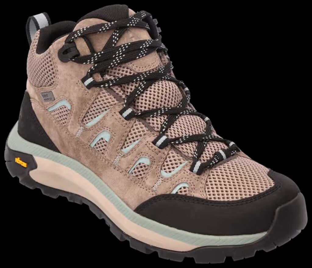 Combining trail-ready toughness with advanced waterproof protection, Ascend® Mojave Mid Waterproof Hiking Boots for women help you take on hiking adventures in comfort. Premium suede leather uppers feature multiple mesh panels to deliver protection you can count on and breathable comfort. Moisture-wicking linings and extremely breathable E-Vent waterproof/breathable membranes inside these sturdy uppers lock out moisture, while still allowing perspiration to escape to keep feet dry and comfortable. Ultralight OrthoLite® TC3 memory foam insoles offer a soft cushioning feel under your feet, while the contoured EVA midsoles provide supportive shock absorption over rough terrain. Lightweight composite shanks provide torsional stability over uneven ground. Durable and non-marking Vibram® XS TREK rubber outsoles deliver great outdoor performance, providing durable traction over various surfaces.
