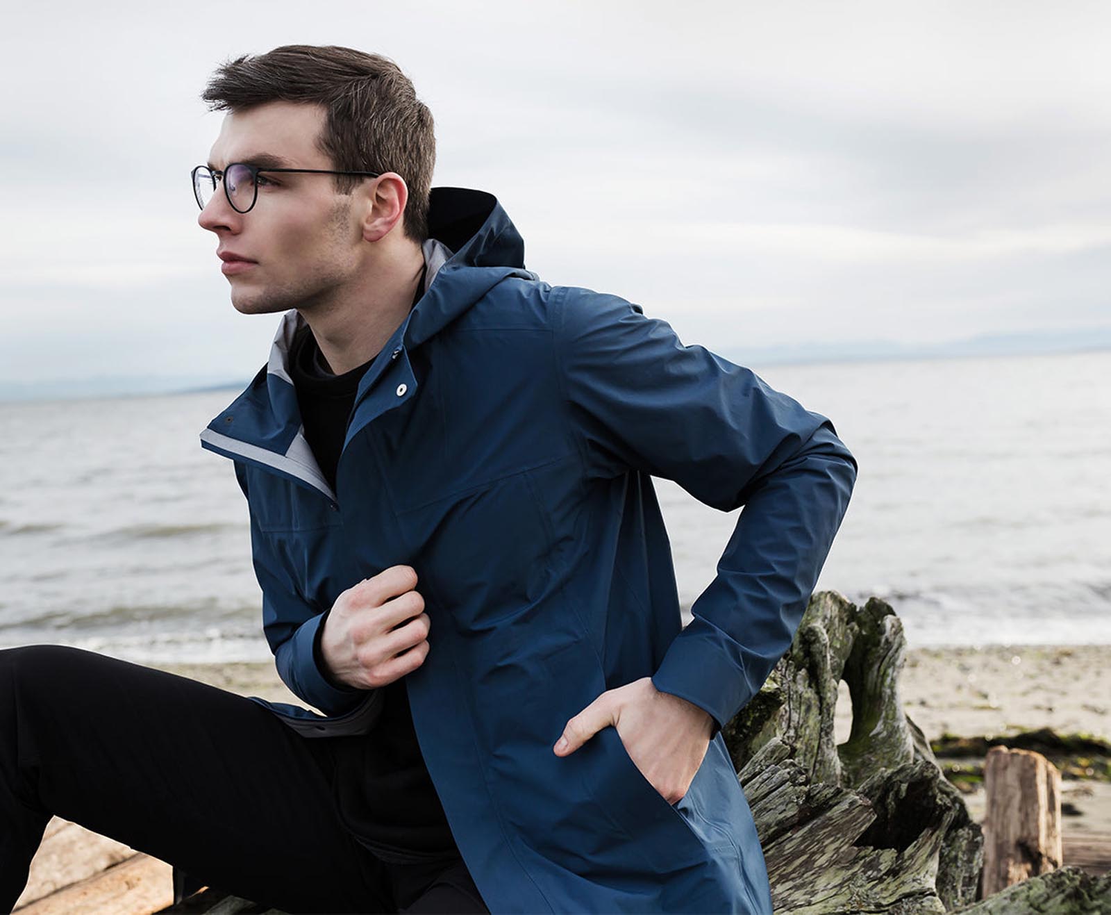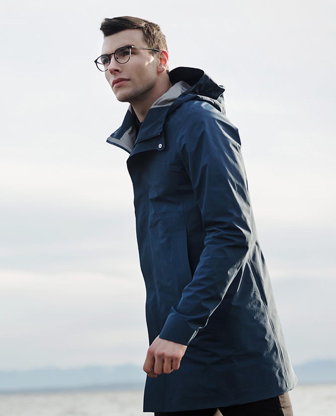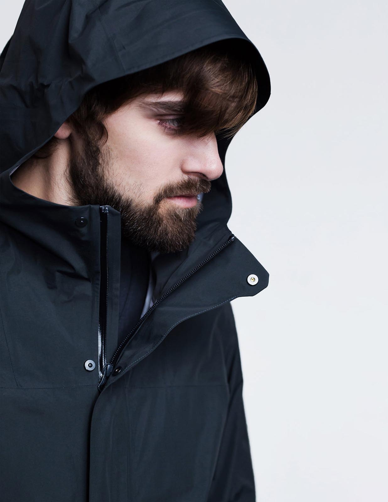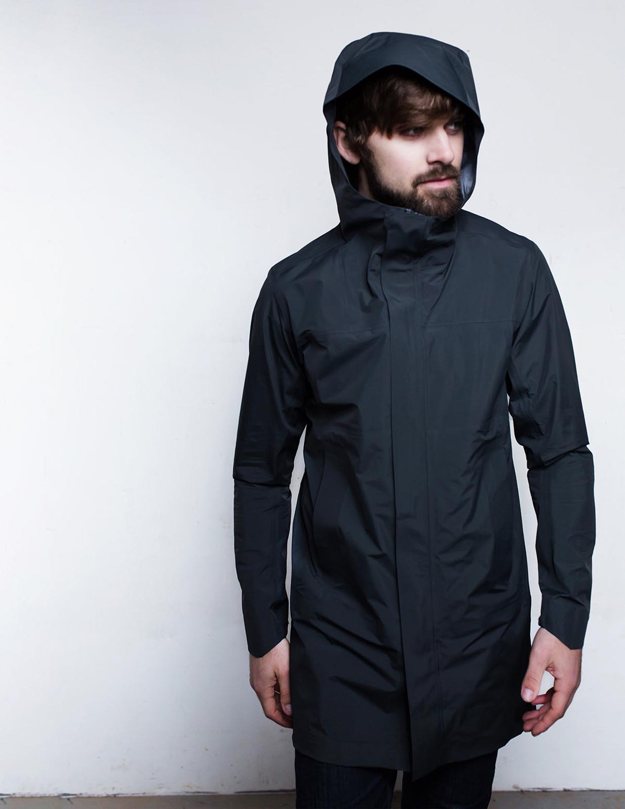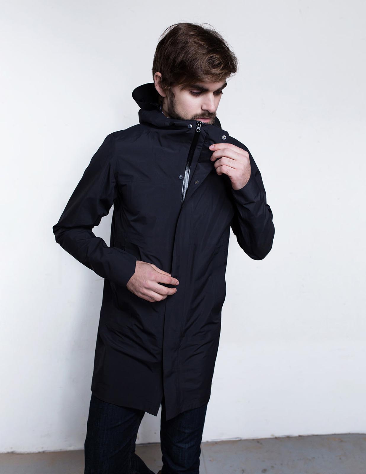 A sleek and minimalistic trench coat. Extended length, adjustable hood and high collar to keep you dry. Using advanced light-weight eVent fabric, this jacket is crafted for wind and rain without compromising style.