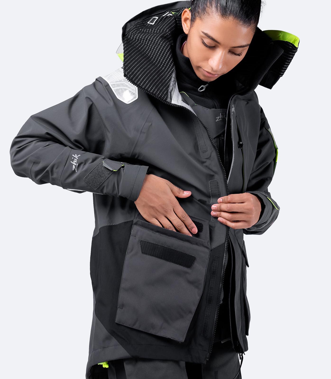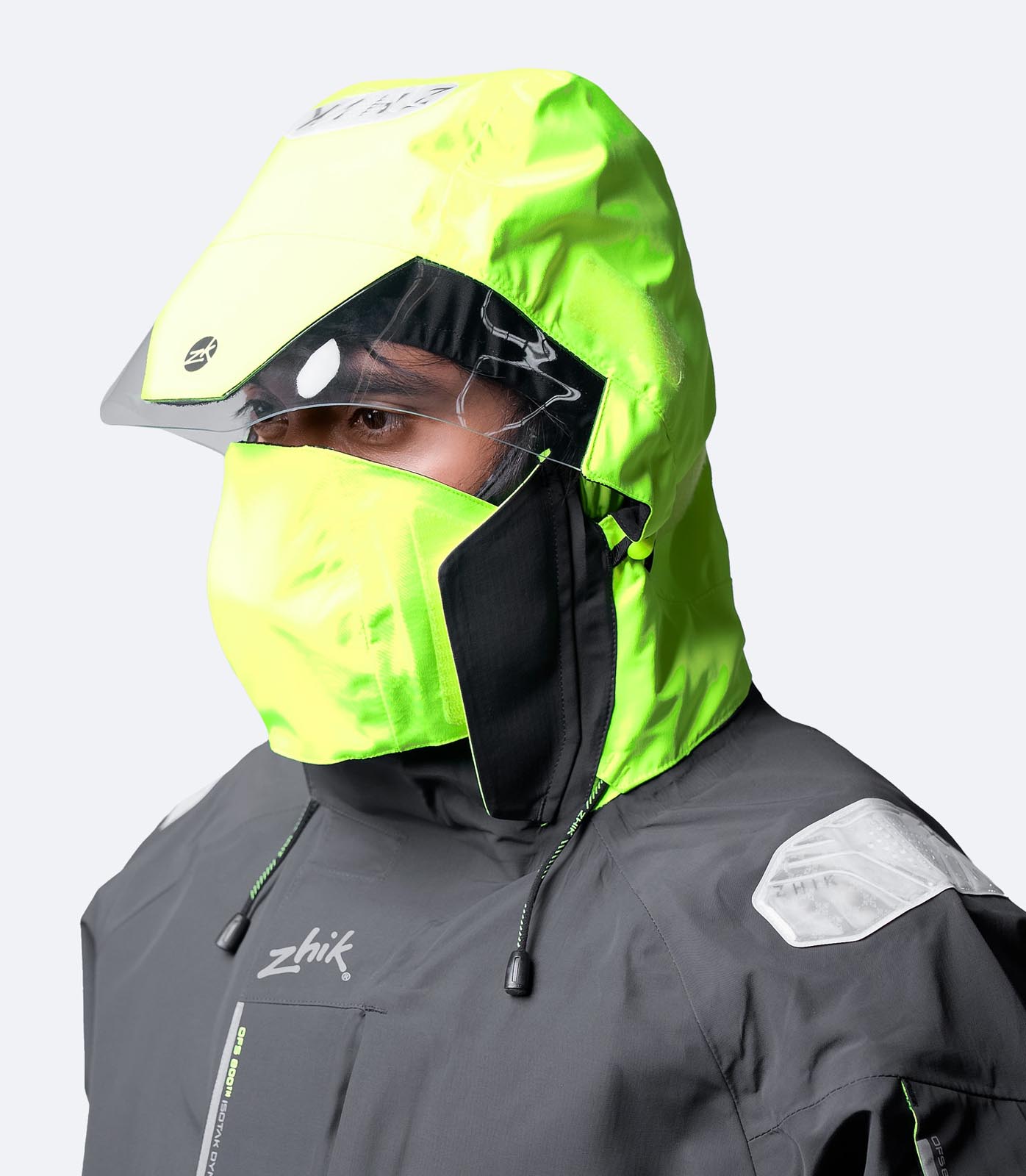 The OFS800™ Jacket is cut for offshore sailing with additional coverage and a relaxed fit for layering. The high cut collar, face shield and hood are all designed to provide excellent protection, adjustability and visibility. Durability has been engineered into the jacket with 500D abrasion resistant panelling in the lower back to protect against harsh decks. It also has primary front zip reinforcement to protect against lifeline wear and anti-corrosion YKK® Vislon® zippers throughout. Additional protection is provided by outer cuff closures and flexible waterproof neoprene inner seals. Photoluminescent (glow-in-the-dark) Reflexite reflectors ensure you can be seen in any light.
