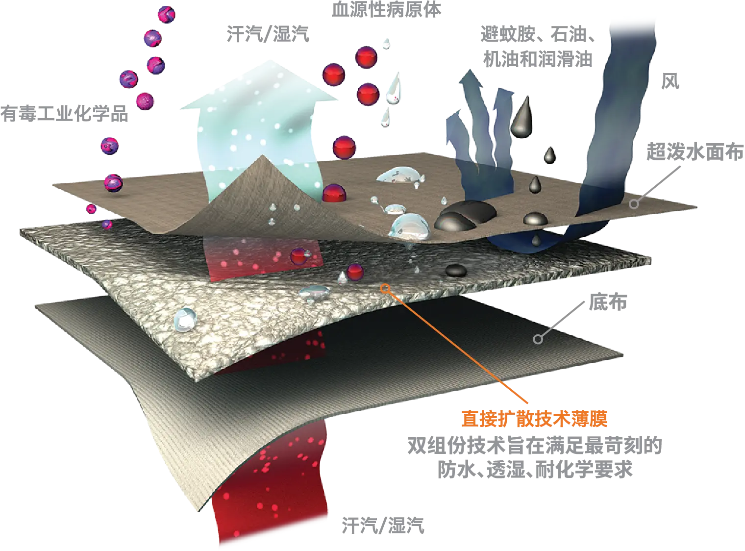 eVent Protective 技术不仅抵御恶劣环境,更能提供对抗化学品和有害物质的关键防护。采用专有的双组分“直接扩散”技术(Direct Diffusion),确保在反复暴露于严苛环境后仍保持卓越的耐用性和防护韧性。