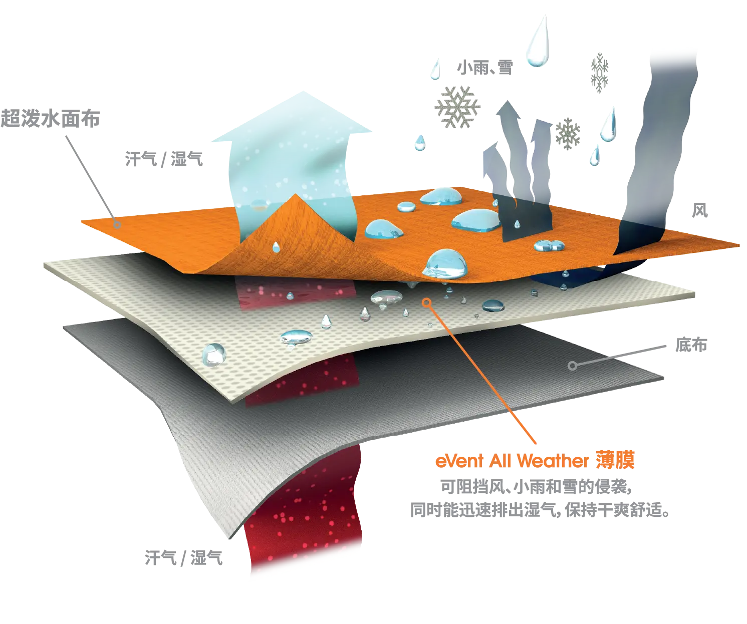 eVent All Weather 是专为各种户外活动而设计的值得信赖的伙伴。3 层透气层压材料可阻挡风力,排出积聚的湿气,在提供雨雪防护的同时又不失舒适性。All Weather 是应对多变环境的理想选择。